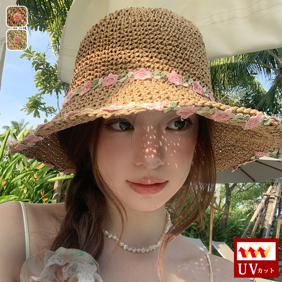 メール便送料無料 麦わら帽子 レディース UVカット UVハット 帽子 ストローハット きれいめ つば広 通気性 紫外線対策 日焼け防止 日よけ 折りたたみ 持ち運び 収納 ワイヤー入り アレンジ 折り曲げ 花柄 ブレード 内側 紐 調節 アウトドア 春 夏