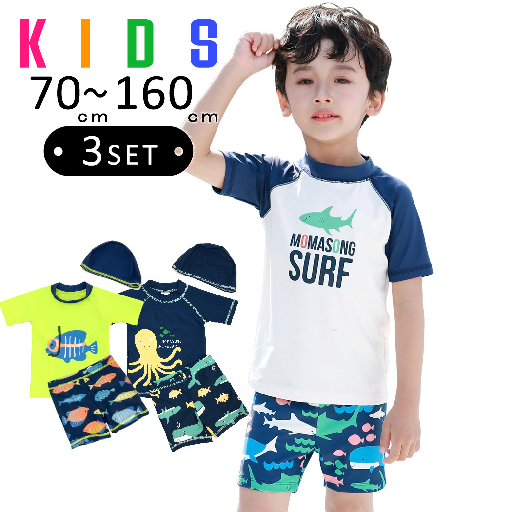 子供 水着 男の子 ラッシュガード 半袖 ショートパンツ キャップ 3点セット セットアップ キッズ ジュニア