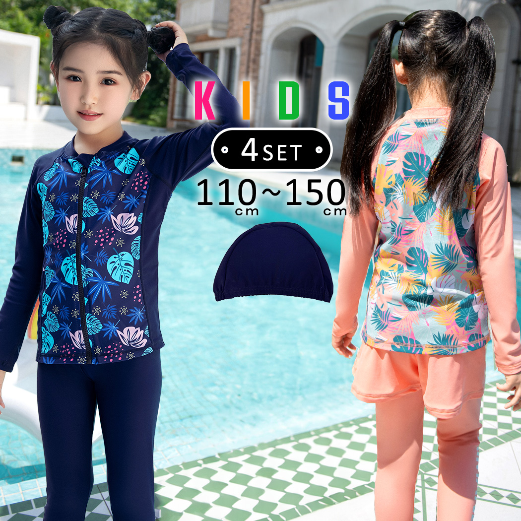 キッズ 水着 女の子 セパレート 長袖 ラッシュガード トップス レギンス ショートパンツ スイムキャップ 4点セット かわいい