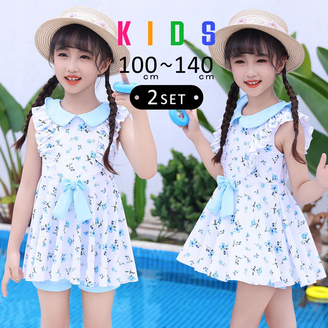 メール便送料無料 水着通販ストア キッズ 水着 女の子 セパレート ワンピース ノースリーブ ショートパンツ 2点セット 花柄 フリル 無地 フロントリボン 襟付き 丸襟 裏地付き ブラライナー ノンワイヤー パッド付き パッド入れ替え 一部サイズのみ 小学生 低学年 高学年 100 110 120 130 140 お嬢様 夏 海 白