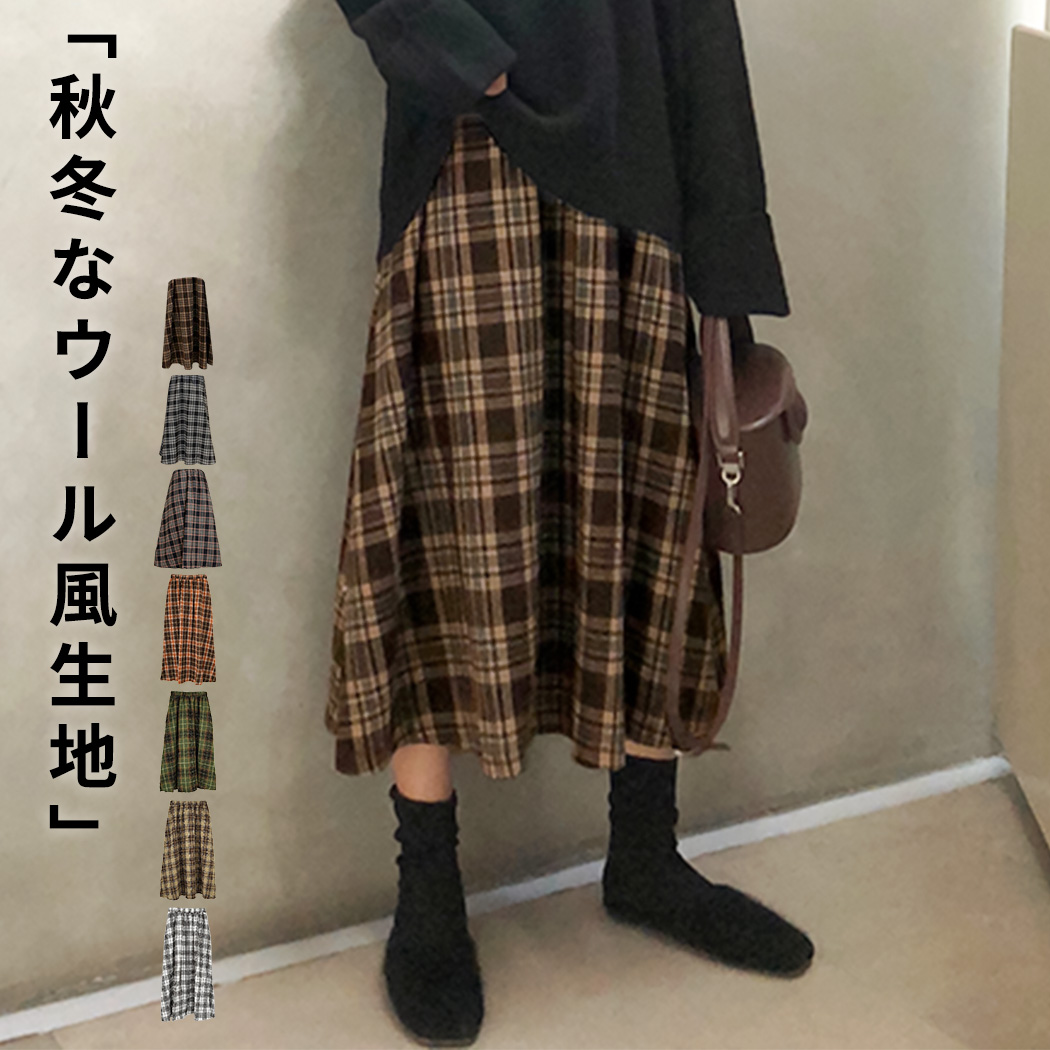 メール便送料無料 スカート ロング レディース 冬 チェック Aライン フレアスカート ボトムス カジュアル 楽 ゆったり ウール風生地 きれいめ 春 秋 黒 白
