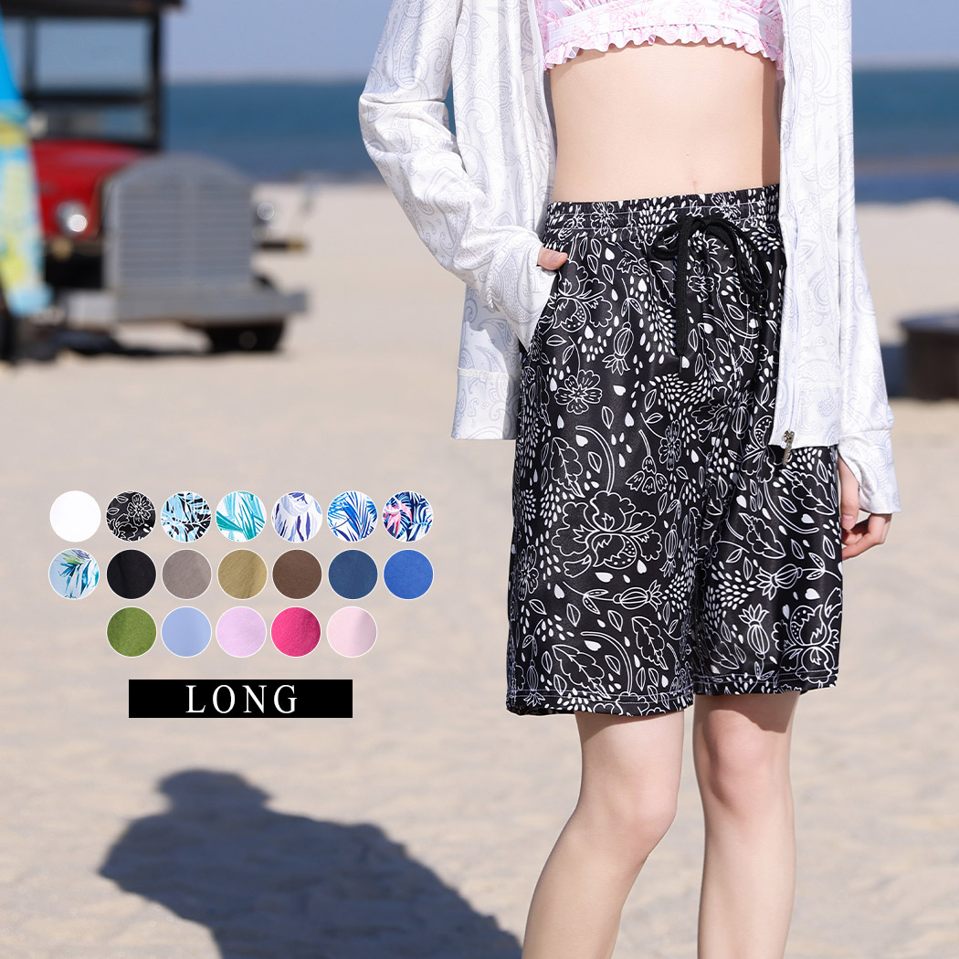 メール便送料無料 水着通販ストア サーフパンツ レディース ロング 水着 体型カバー おしゃれ 水陸両用 ハーフパンツ ボードショーツ 大きいサイズ 黒 白 夏 薄手 膝丈 ひざ丈 ポケット ウエストゴム ひも付き 裏地付き ウエスト ヒップ 太もも カバーアップ 無地 ボタニカル サーフィン アウトドア レジャー