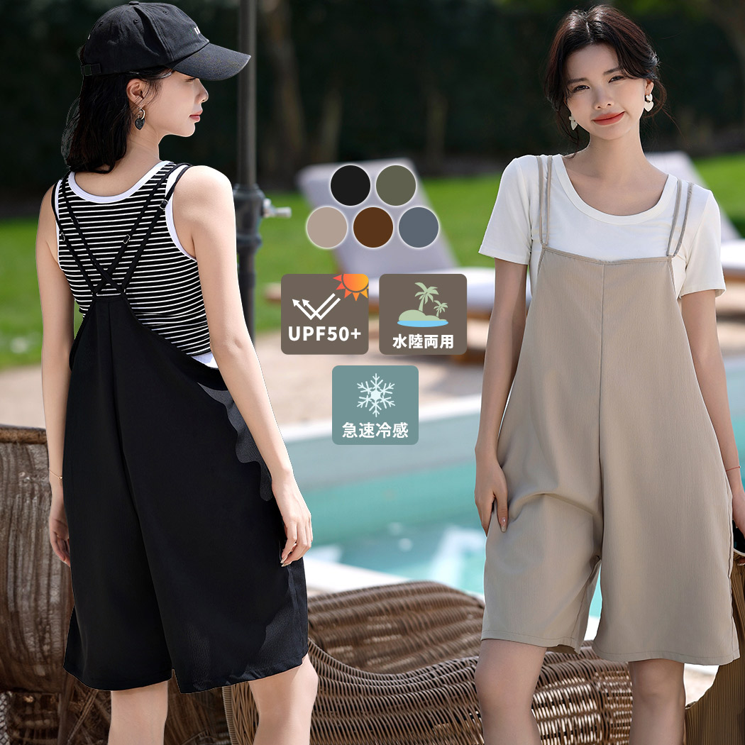 メール便送料無料 サロペット 水着 ラッシュガード パンツ キレイめ レディース ゆったり オールインワン ハーフパンツ ショートパンツ 肩紐調節 アジャスター バッククロス ダブルストラップ ポケット ウエスト ヒップ 太もも カバーアップ 服見え 薄手おしゃれ