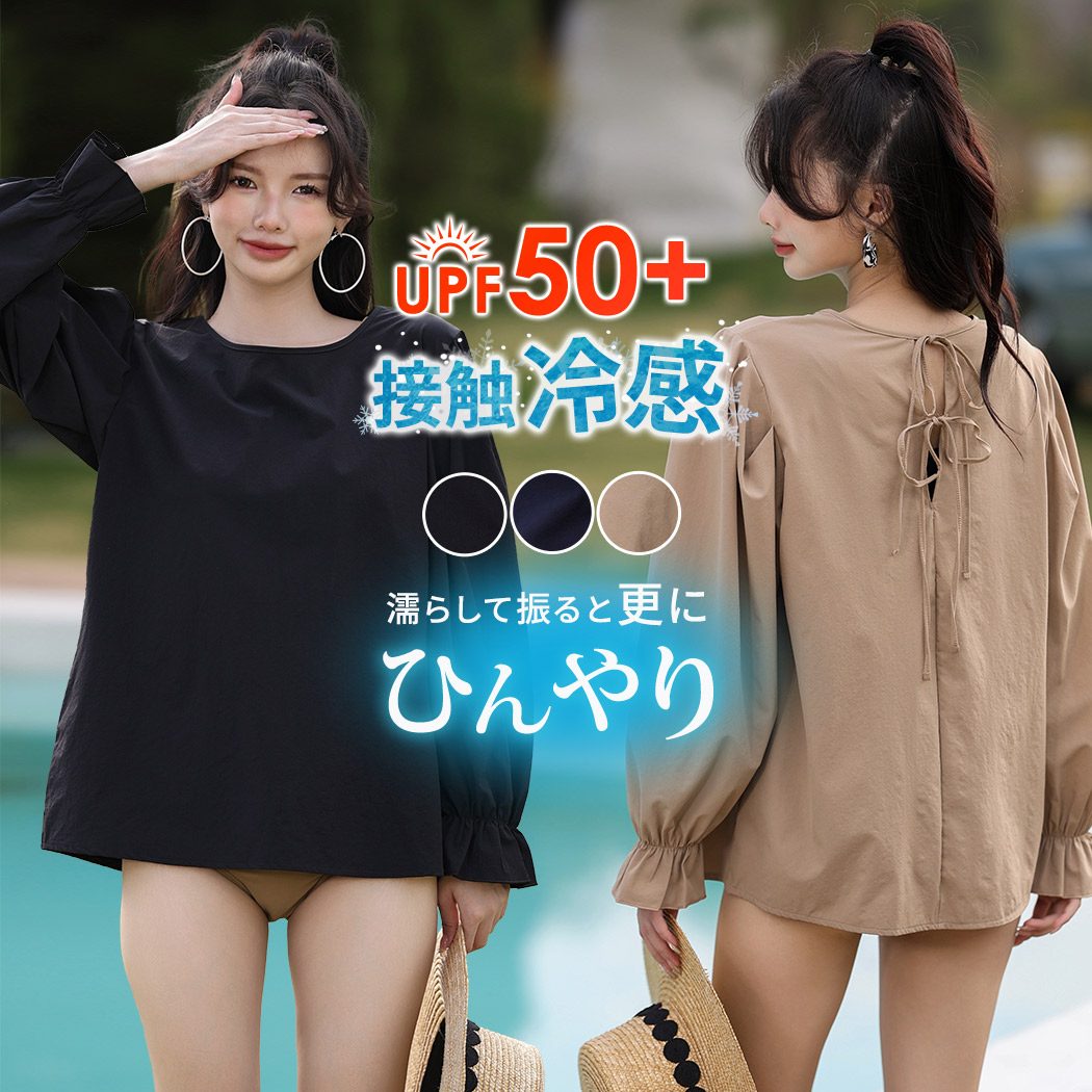 メール便送料無料 水着通販ストア ラッシュガード レディース 長袖 水陸両用水着 体型カバー UPF50+ おしゃれ かわいい フードなし 上着 薄手 ライトアウター プルオーバー 黒 無地 袖フリル キャンディスリーブ バックリボン バックシャン プール 水泳 アウトドア レジャー 紫外線対策