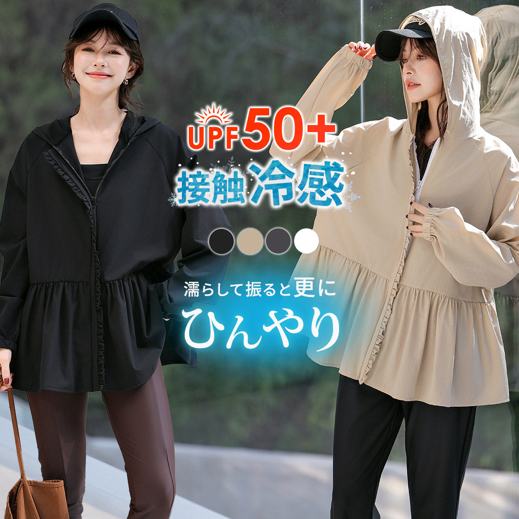 メール便送料無料 水着通販ストア UVカット率 99%以上 ラッシュガード レディース トップス 長袖 体型カバー ラッシュパーカー UPF50+ 接触冷感 急速冷感 羽織 ペプラム フリル ジップアップ 前開き 洋服見え フーディー ラグランスリーブ フード付き 袖口ゴム 黒 白 夏 海 ママ
