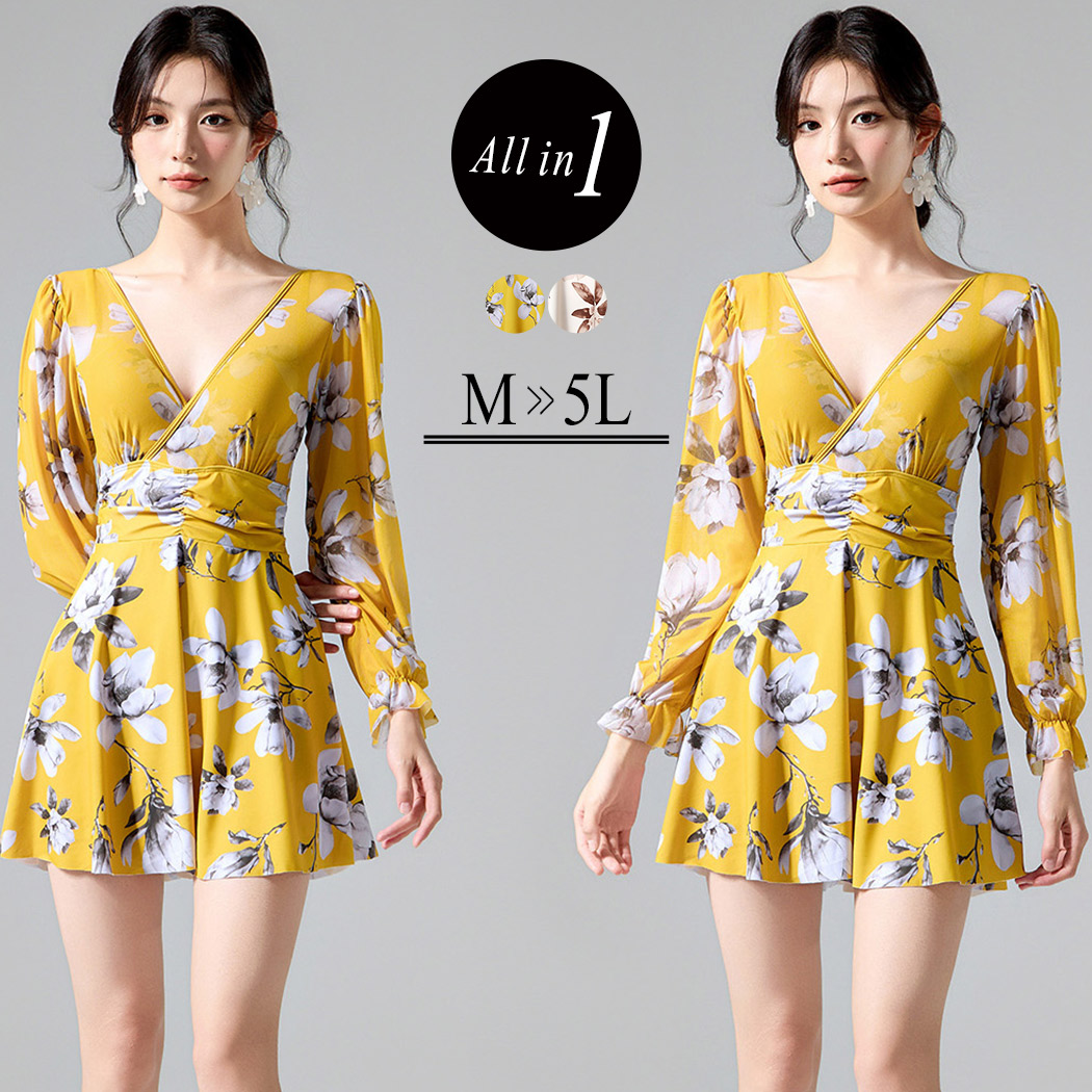 ワンピース水着 体型カバー お洋服みたいな水着 大人 花柄 オシャレ カシュクール 美バスト 袖あり プラスサイズ水着 夏 海 プール リゾート 白