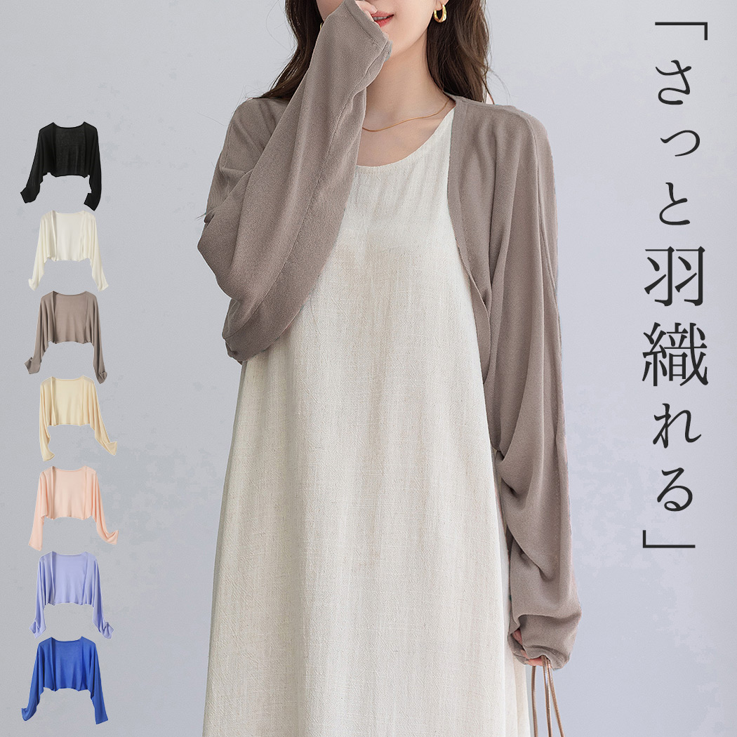 メール便送料無料 「さっと羽織れる」ボレロ カーディガン ショート丈 薄手 レディース 長袖 トップス サマーニット 透け感 ドルマンスリーブ 羽織り 伸縮性 通気性 涼しい オフィスゆったり シンプル きれいめ 普段着 着回し 通勤 通学 事務 白 黒 夏 春 秋