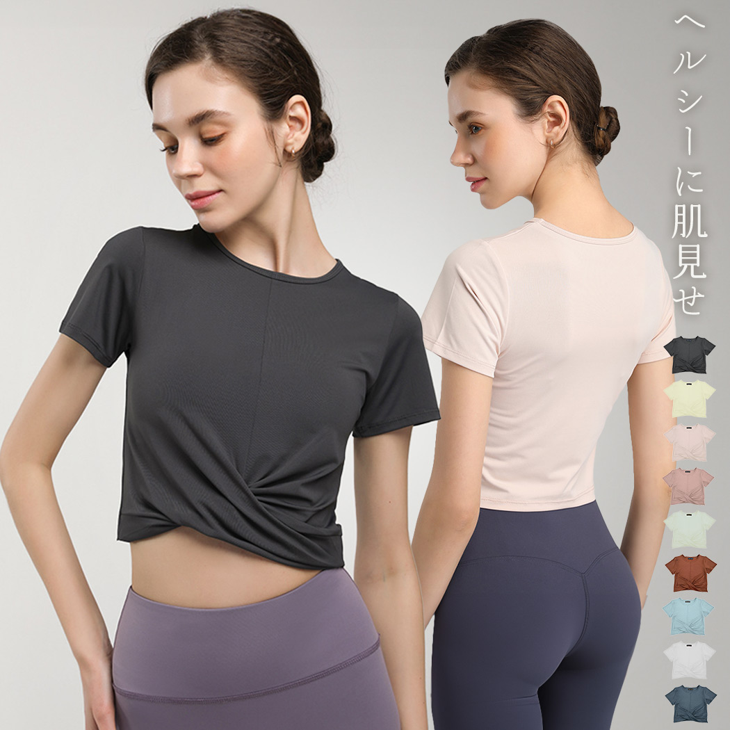 ヨガウェア トップス レディース ピラティス ウェア 半袖 ヨガトップス ヨガtシャツ 薄手 クロップド丈 セットインスリーブ シンプル 無地