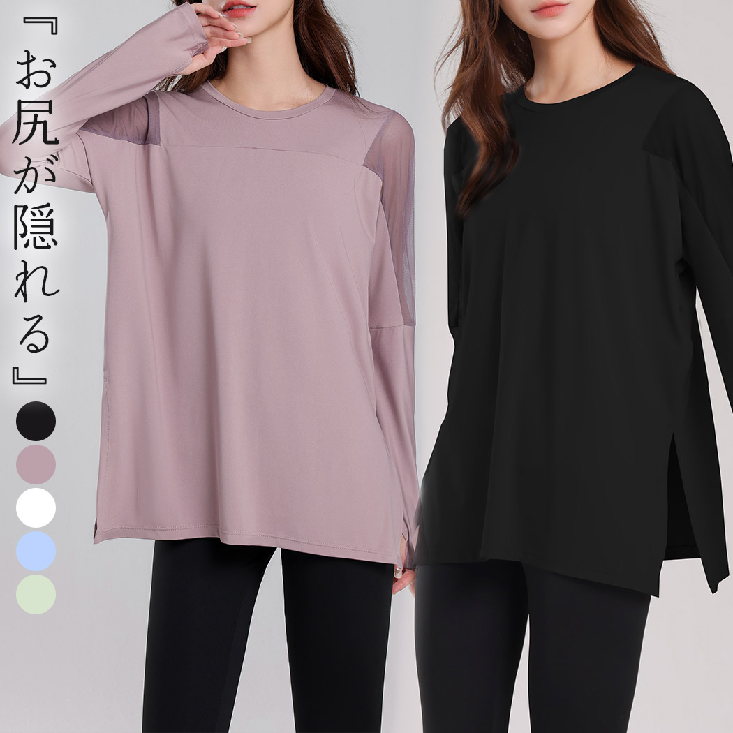 メール便送料無料 ヨガ ウェア トップス レディース 長袖 スリット ラウンドネック 袖 メッシュ 通気性 涼しい サムホール 指穴 速乾 吸汗 ゆったり 体型カバー ヨガトップス スポーツウェア フィットネスウェア ピラティスウェア ジムウェア ダンス スポーツTシャツ ストレッチ 薄手 黒 白