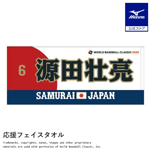 源田壮亮 応援フェイスタオル 選手名 番号入り 2026 WORLD BASEBALL CLASSIC TM ミズノ公式 ミズノ MIZUNO 侍ジャパン 源田