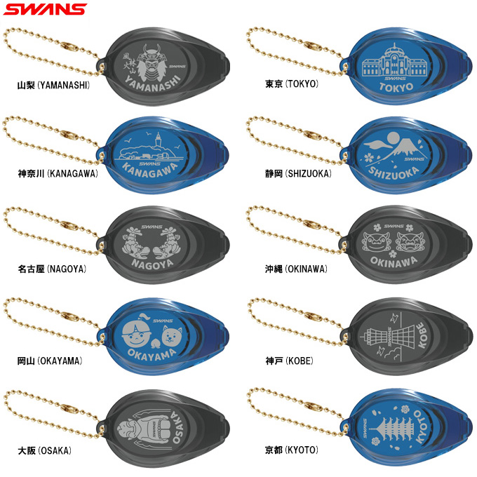 スワンズの数量限定のスイムゴーグル型ご当地キーホルダー。