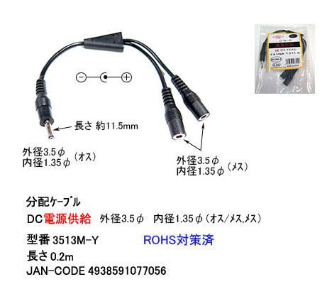 DC分配コード(外径3.5mm内径1.35mm)オス⇔メス×2 [カモン 3513M-Y]