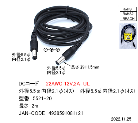 両端DCコード(外径5.5mm内径2.1mm) 2m [カモン 5521-20]