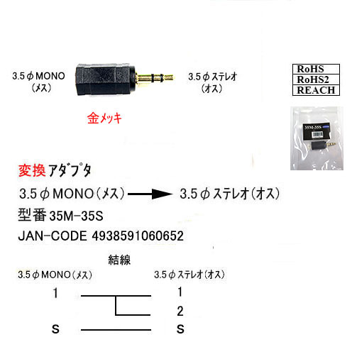 3.5mmφモノラルミニ(メス)⇔3.5mmφステレオミニ(オス)変換アダプタ