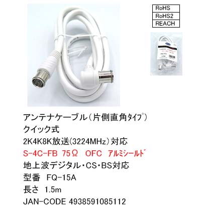 S4C-FBアンテナケーブル 1.5m片側L型<Fクイックタイプ>[カモン FQ-15A]
