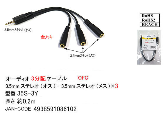 オーディオ3分配ケーブル(3.5mmステレオ(オス)⇔3.5mmステレオ(メス)×3) [ カモン 35S-3Y]