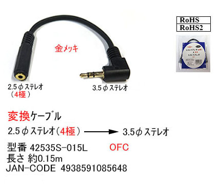2.5mmφ4極ステレオ→3.5mmφ3極ステレオ変換ケーブル [カモン 42535S-015L]