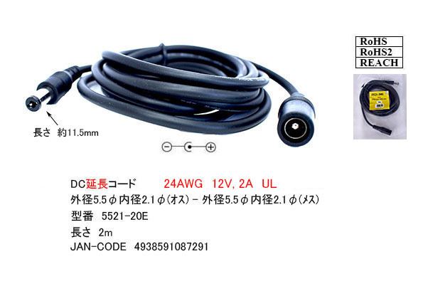 DC延長コード(外径5.5mm内径2.1mm) 2m [カモン 5521-20E]