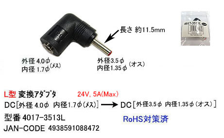 DC変換アダプタ L型[外径4.0mmφ 内径1.7mmφ]メスー[外径3.5mmφ 内径1.35mmφ]オス