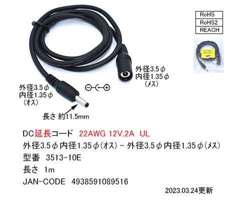 DC(外径3.5mm内径1.35mm)電源延長ケ−ブル