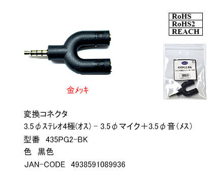 4極ステレオ3.5mm(オス)-3.5mm音+マイク(メス)変換コネクタ (黒) [カモン 435PG2-BK]
