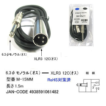 6.3mmφモノラル(オス)⇔3ピンマイク(オス) ケーブル 1.5m [カモン M-15MM]