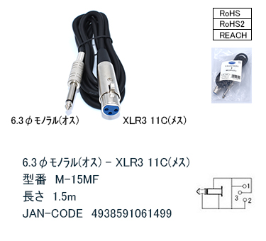 6.3mmφモノラルク(オス)⇔3ピンマイク(メス) ケーブル 1.5m [カモン M-15MF]