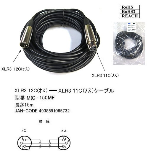 3ピンマイク延長ケーブル 15m [カモン MIC-150MF]