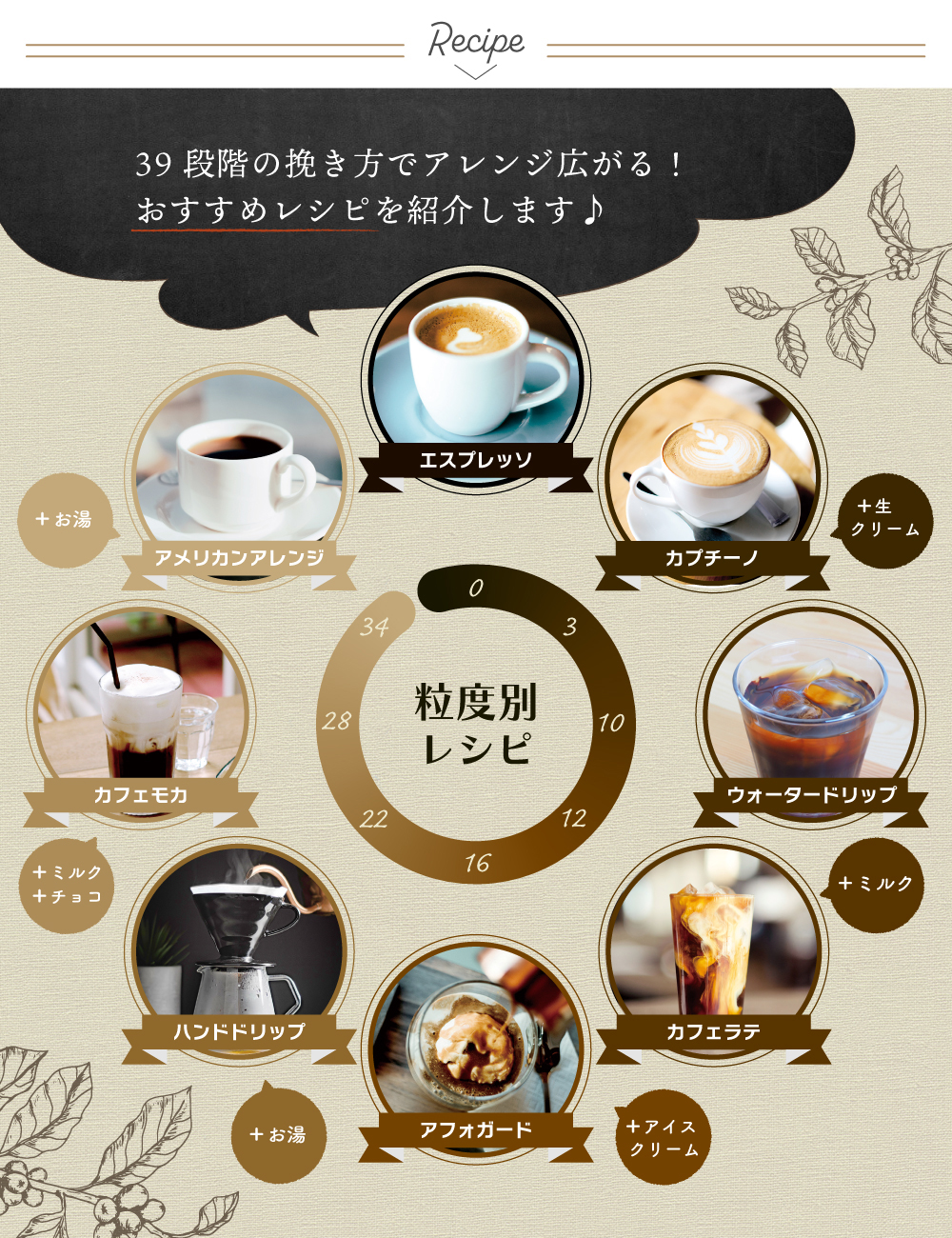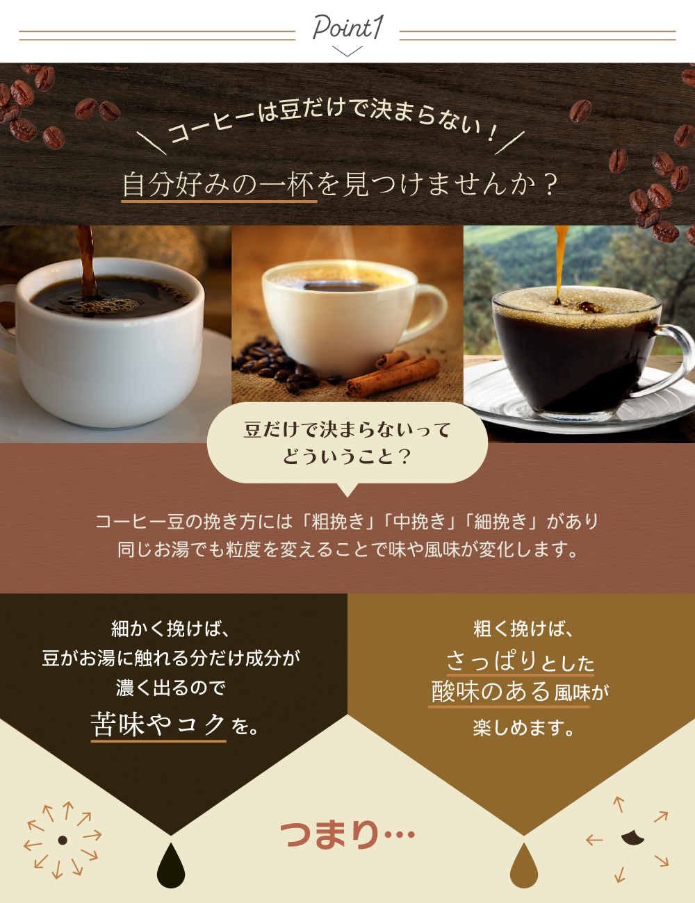 粒度(豆の粗さ)にもこだわって、手軽に自分好みの一杯を見つけてみませんか?