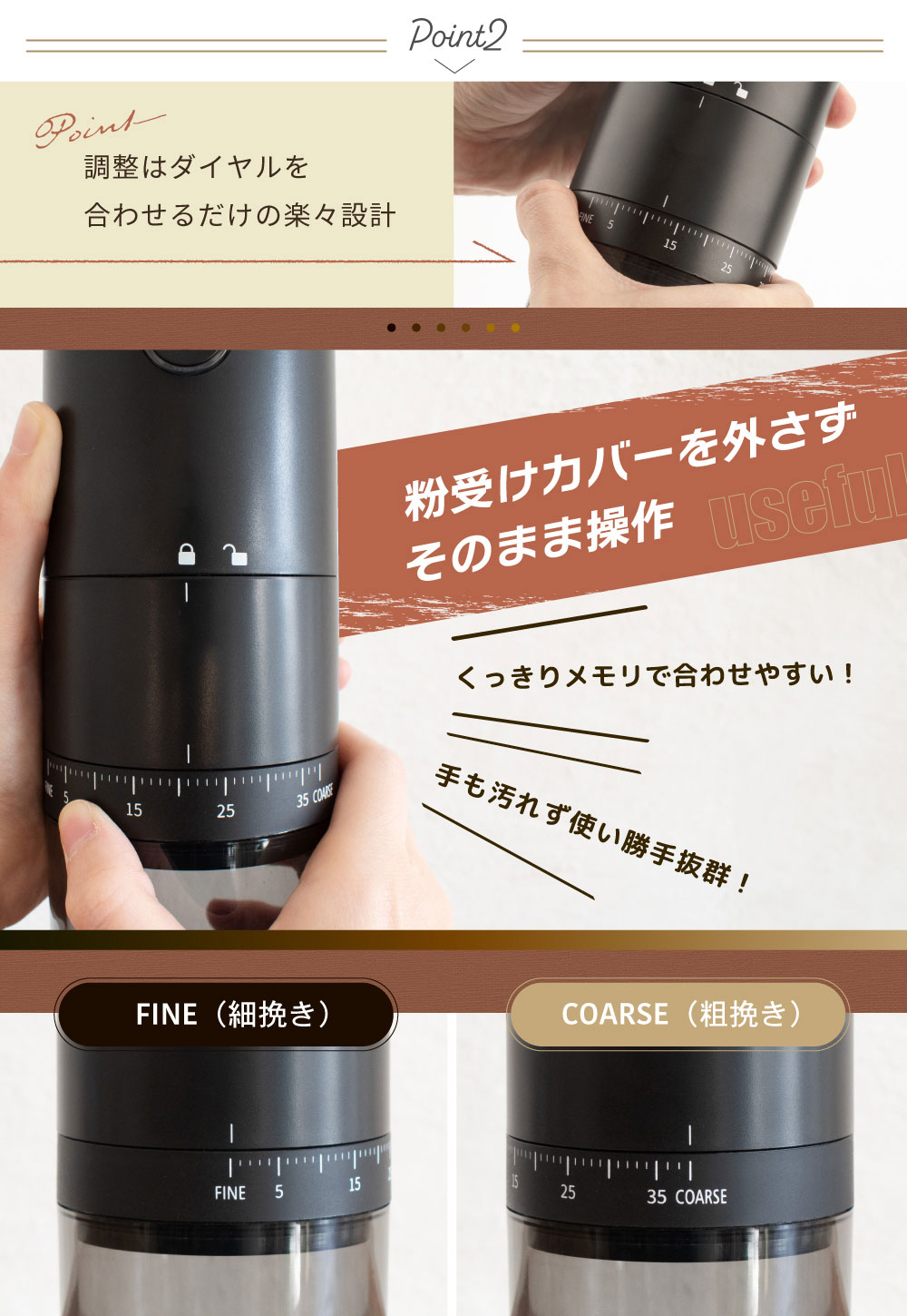 粒度は簡単にセットできるダイヤル式。粉受けカバーを外さずに操作できるから手も汚れず使い勝手抜群!