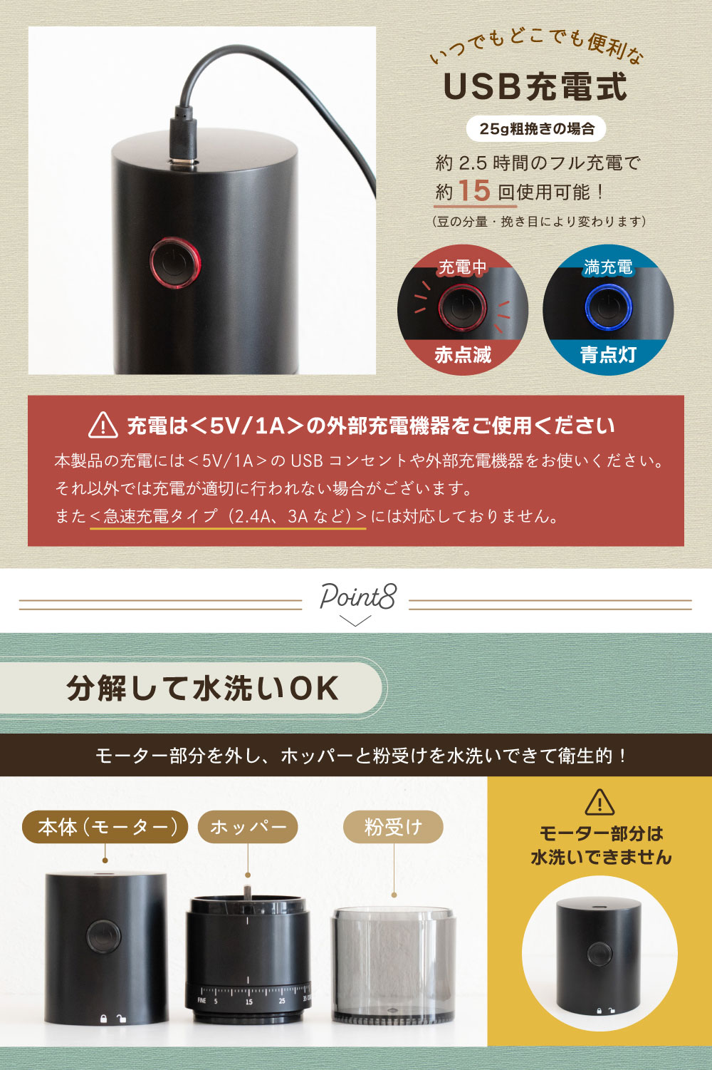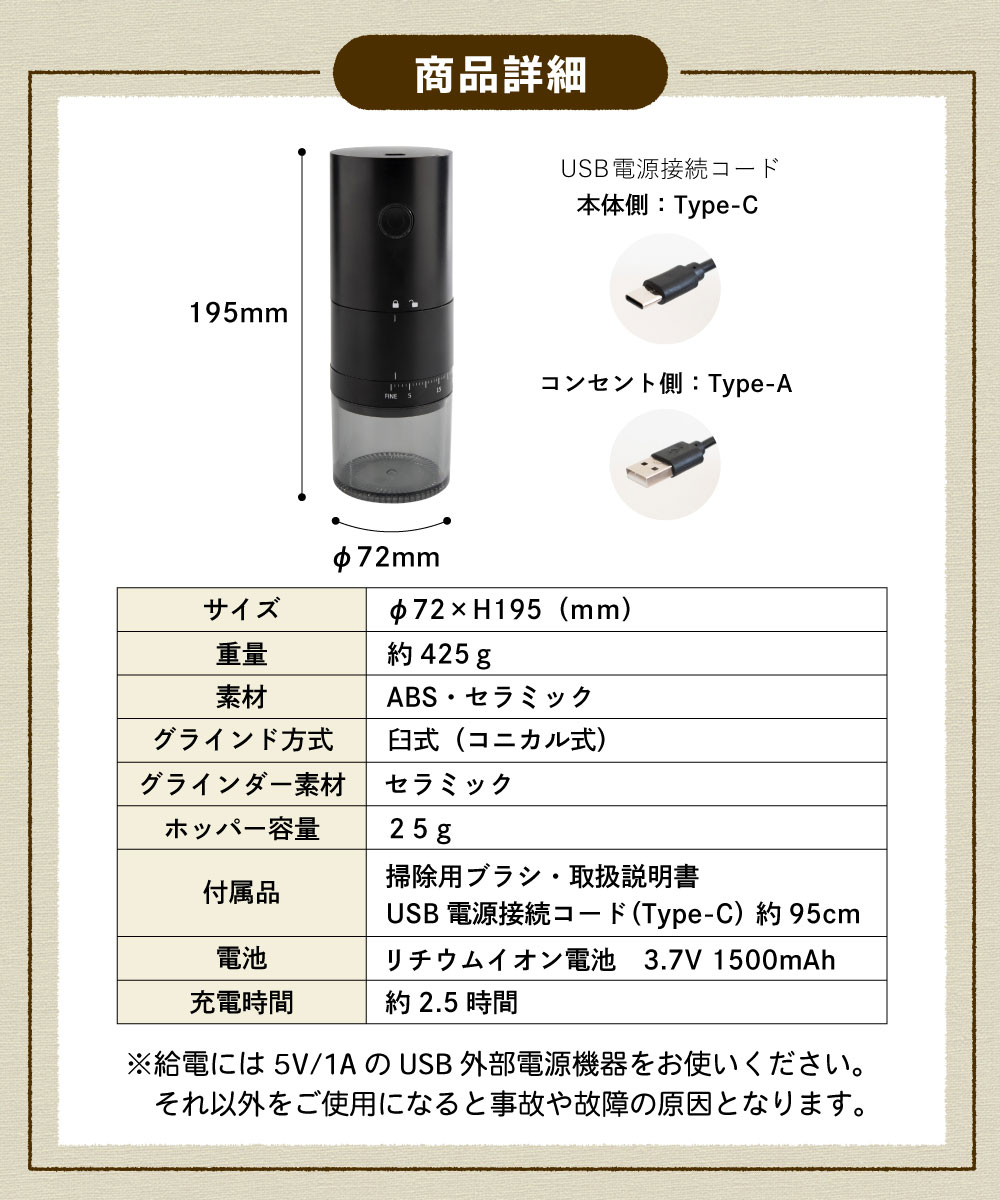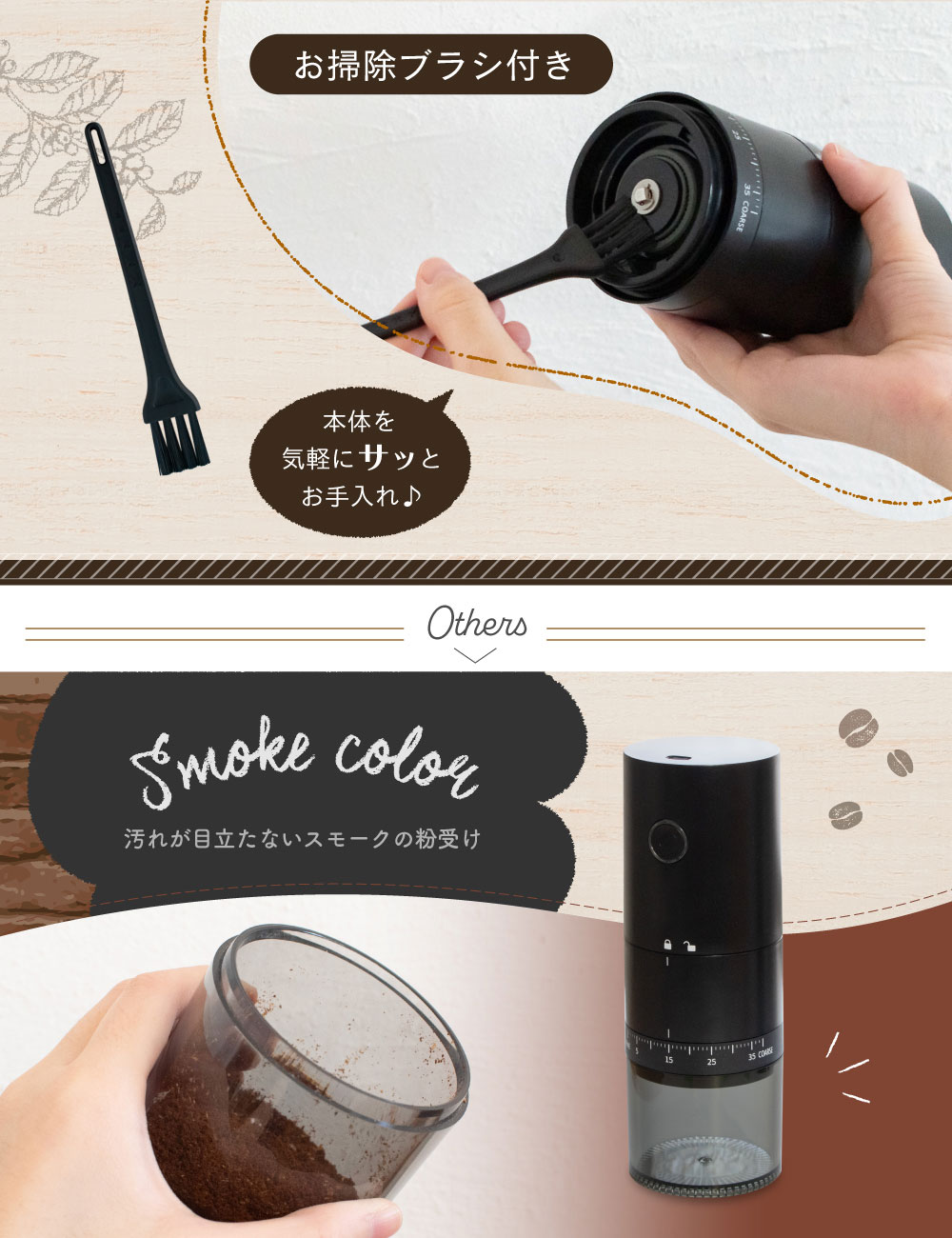 電動コーヒーミル 小型 臼式 コニカル式 コーヒーミル 電動 39段階 洗える 水洗い アウトドア 充電式 コンパクト セラミック コードレス リンクス ワンセカンド