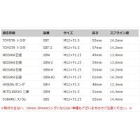 | 適応車種 | 品番 | サイズ | 長さ | スプライン径 | | TOYOTA トヨタ | SBT | M12×P1.5 | 52mm | 14.2mm | | TOYOTA トヨタ | SBT-2 | M12×P1.5 | 57mm | 14.2mm | | NISSAN 日産 | SBN | M12×P1.25 | 49mm | 13.0mm | | NISSAN 日産 | SBN-A | M12×P1.25 | 51mm | 14.2mm | | HONDA ホンダ | SBH | M12×P1.5 | 48mm | 12.3mm | | MITSUBISHI 三菱 | SBM | M12×P1.5 | 51mm | 14.3mm | | SUBARU スバル | SBS | M12×P1.25 | 52mm | 14.4mm | |