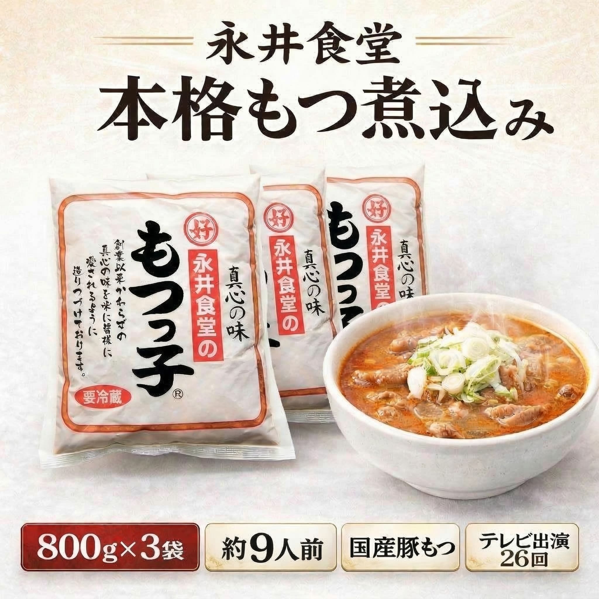 創業60年の老舗・永井食堂が作り続けてきた味を家庭用に仕立てた調理済みもつ煮です。テレビ出演26回の実績を持つ完成度を、湯煎のみで再現できます。下処理済みの国産豚もつを使用し、家庭調理で起きがちな下処理の手間や味ブレを排除。スープ量でかさ増しせず、モツを主役にした構成のため、一口ごとにモツの存在感を感じられる仕上がりです。1袋800g、複数袋セットで主菜・家飲み・ストック用途にも対応します。