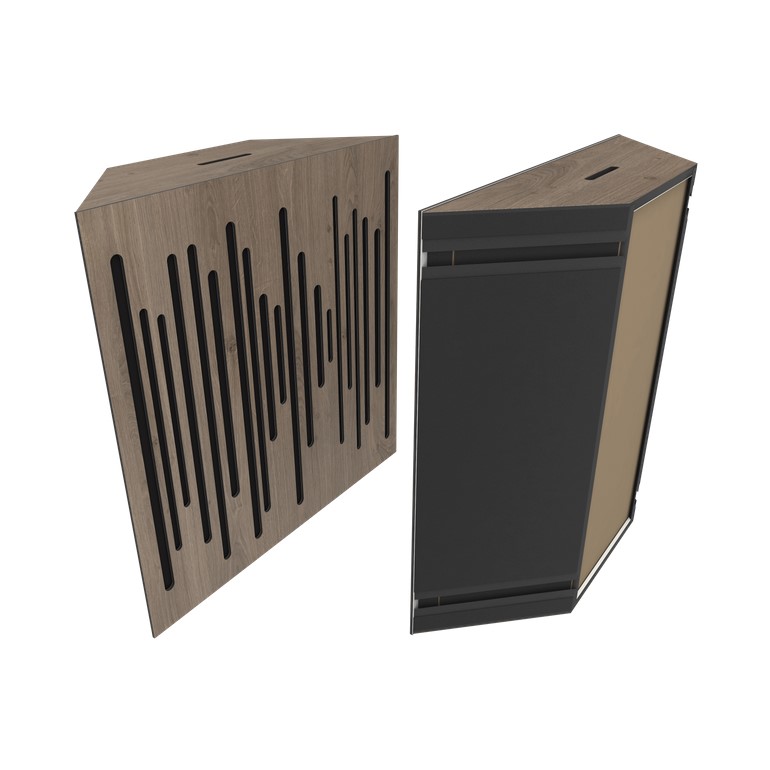 さらに、ウッドのフロントパネルは2つの役割を果たします。中高域の周波数を十分に吸収し、サウンドを弱めることなく部屋の隅での反射を制御する一方、拡散パネルとしても機能します。