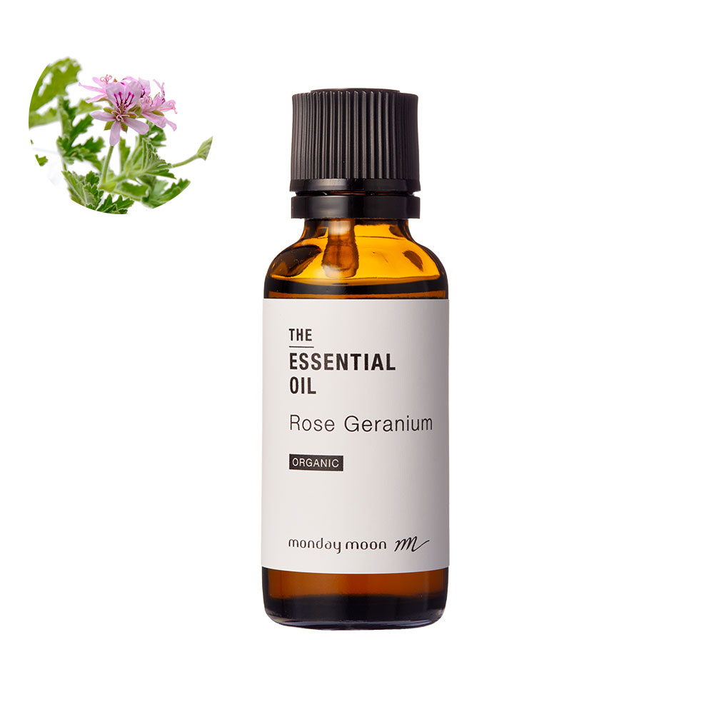 マンデイムーンのローズゼラニウム・エッセンシャルオイル・オーガニックは、南アフリカで持続可能な方法で有機栽培されたローズゼラニウム(Pelargonium roseum × asperum)の葉から抽出しました。