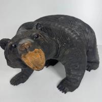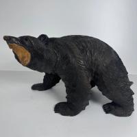 北海道民芸品として知られる木彫りの熊、リアルな表情と力強い造形が特徴的な彫刻作品です。全長約48cmと存在感あるサイズで、玄関や店舗、応接スペースなどのインテリアとしても映える一品です。細やかな毛並みの彫りと、口元の荒々しさが見事に表現されています。