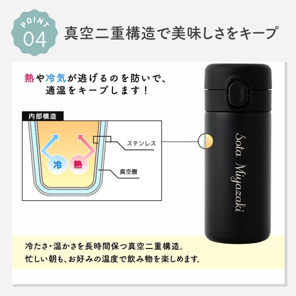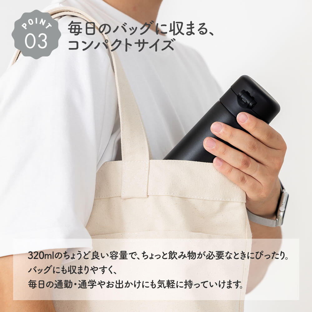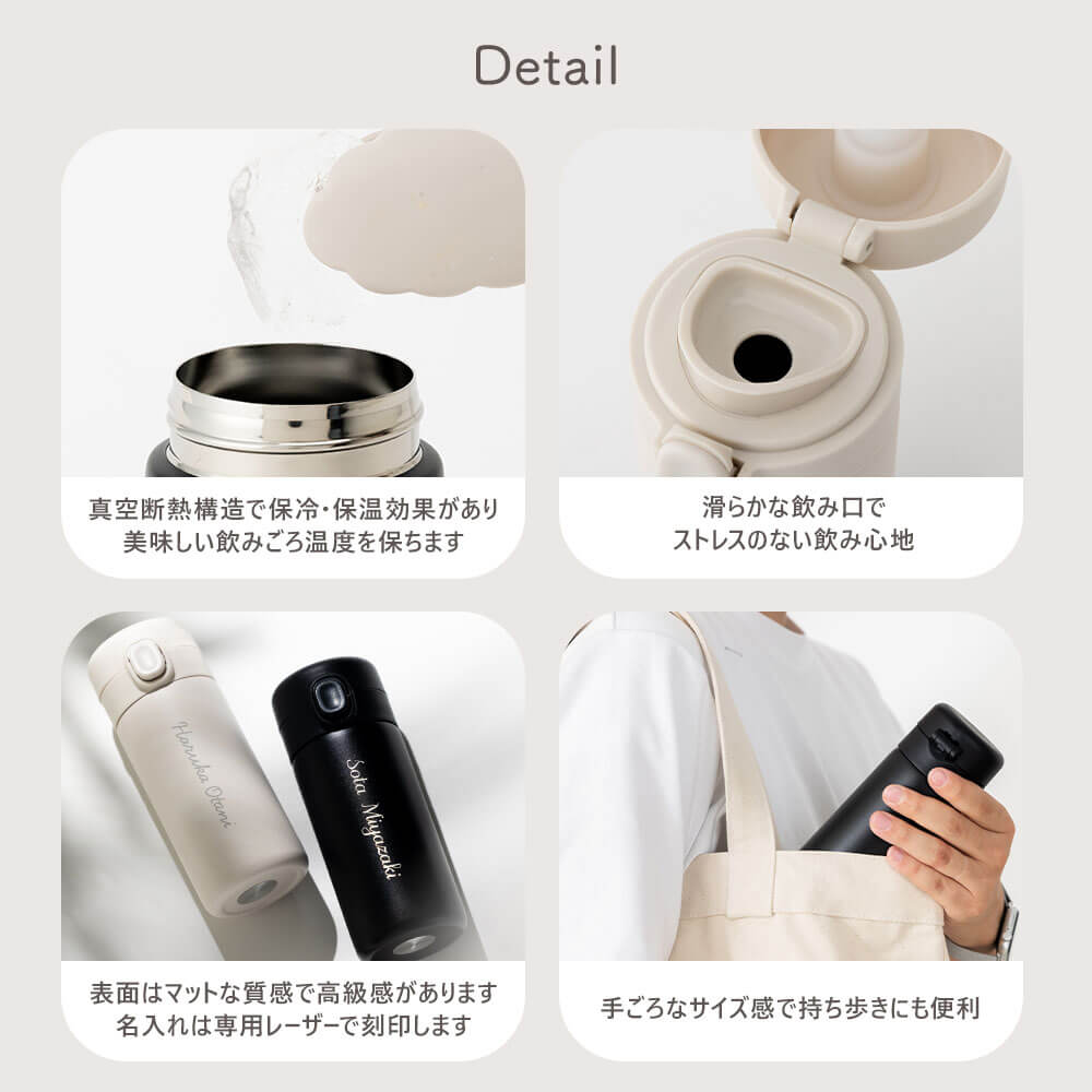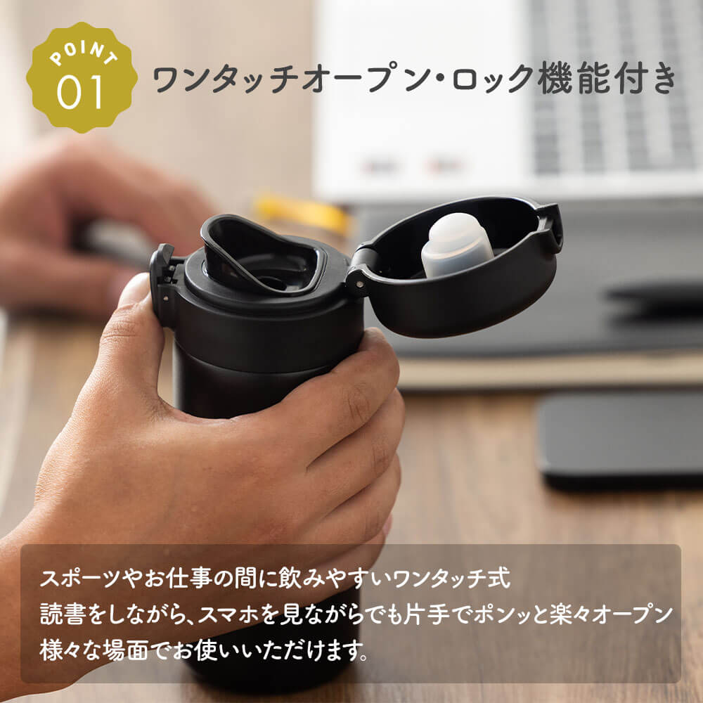 | 商品詳細 | 片手でサッと開けられるワンタッチ開閉式だから、通勤中や仕事中でもスムーズに水分補給。 ボタンひとつでストレスなく開け閉めできるから、移動中や子育て中の方にも人気です。 |