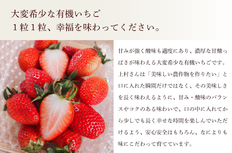 栽培期間中、農薬・化学肥料不使用で栽培した大変貴重なオーガニックの苺です。甘みが強く酸味のバランスが絶妙!濃厚な甘酸っぱさが味わえる健康な有機いちごです。