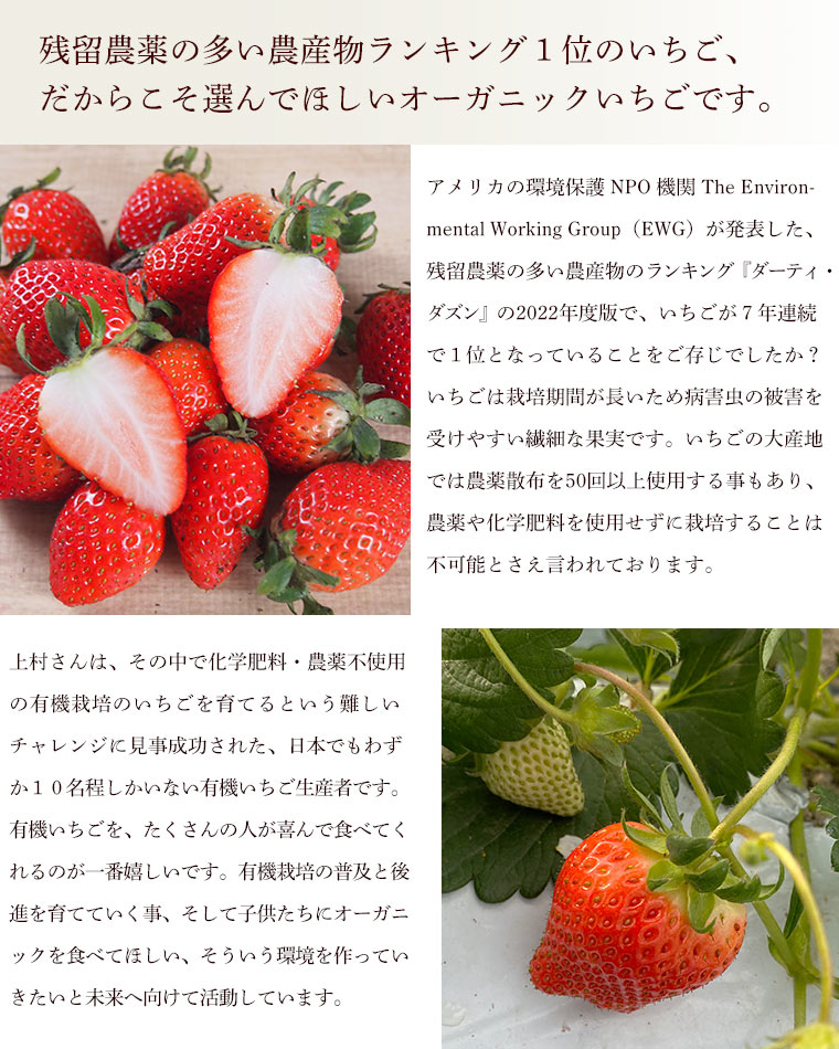 上村さんは、その中で化学肥料・農薬不使用の有機栽培のいちごを育てるという難しいチャレンジに見事成功された、日本でもわずか10名程しかいない有機いちご生産者です。