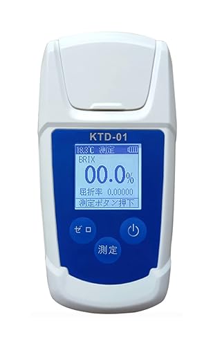 糖度計 日本語表示 デジタル 果物 【日本語仕様】 屈折計 測定器 温度自動補正 Brix0-55% 測定精度±0.1% 野菜 飲料 糖度測定器【屈折計の糖度計】果物の果汁やワイン、ジュースなどの液体に含まれる糖の含有率を光の屈折を用いて測定する「屈折計」の糖度計です。農林水産省で糖度基準としている糖用屈折計示度のBrix値で糖度が表示され、0〜55%までのBrix値を±0.2%の誤差で測定できます。測定結果も大きな液晶画面で表示されるので大変見やすい設計です。【遮光カバー付で正確に測定】光を利用する「屈折計」では、太陽光など光の強度が強い場所では測定ができません。また外気温でも測定結果が異なります。TD-Bは果樹園など外の環境でも糖度測定ができるように、皿の部分に遮光カバーを付属。しかも測定できない強い光ではエラー表示で、外気温も液晶画面で教えてくれるので、遮光カバーを使うか使わないかの判断も簡単です。【操作が簡単】糖度計KTD-01の操作はとっても簡単。皿の部分に蒸留水を2、3滴たらしてリセットボタンで0%にし、一度拭き取って測定したい液体を2、3適垂らして測定ボタンを押すだけ。ものの3秒でBrix値を割り出します。※ご使用は外気温10〜40℃の範囲で行ってください。【ハンディタイプで使いやすい】糖度計TD-Bは縦12cm、横6cmと手のひらサイズ。ポケットに入れて持ち運べるので、リンゴやミカン、イチゴ、メロン、西瓜など果樹園や畑で糖度を測りたい時に大変便利。またお料理や体調管理で甘さが気になる方も、手軽に使えるTD-Bなら簡単に糖度が測れます。