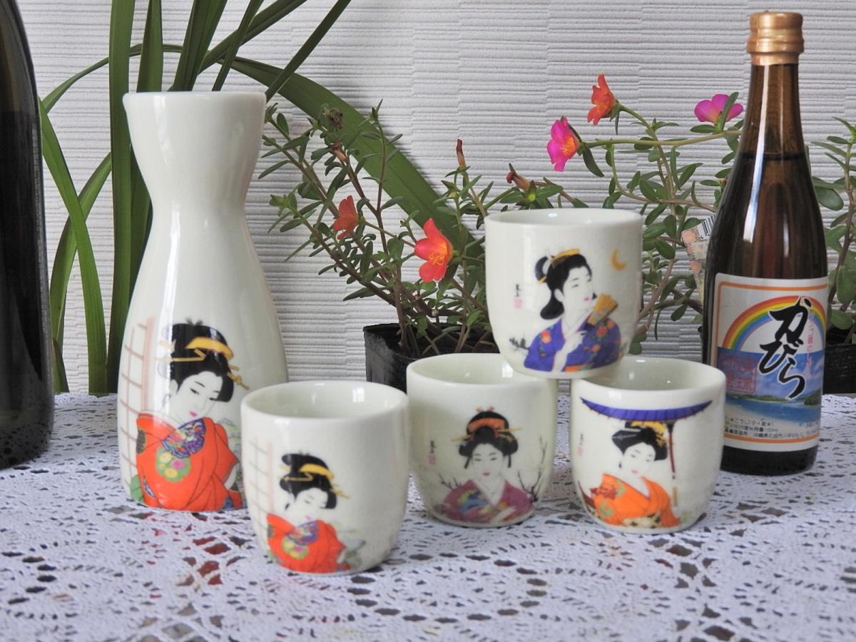 オシャレな美人酒器セット伝統的芸者絵画Porcelainware, Sake Bottle set with Geisha Girl design.