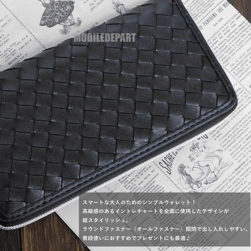 ラウンドファスナー 長財布 メンズ イントレチャート 編み込み 財布 レディース 使いやすい 男女兼用 ブラック 黒