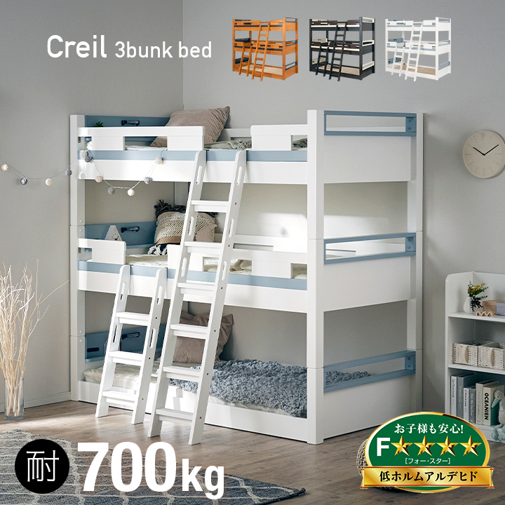 3段ベッド 三段ベット シングルベッド すのこベッド 子供 大人 分割可能 宮棚付き コンセント LED照明 木製 頑丈 おしゃれ 三段ベッド Creil(クレイユ) 3色対応