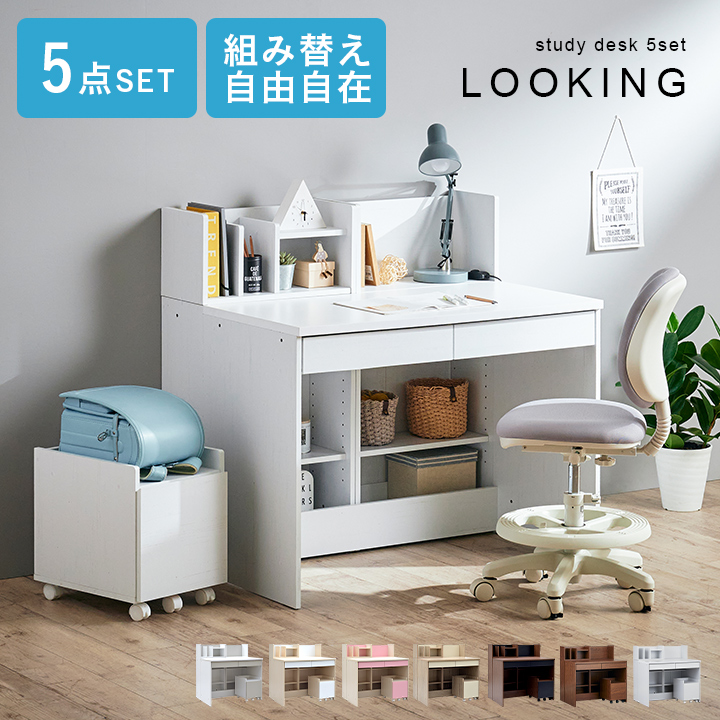 学習机セット 学習机 学習デスク 勉強机 シンプル 収納 木製 コンパクト 子供 おしゃれ デスク収納 白 幅100cm 5点セット LOOKING3 ルッキング3 7色対応