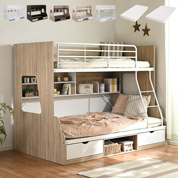 上下サイズ違い 収納付き マットレス付き 二段ベッド 2段ベッド 親子二段ベッド シングル セミダブル 親子ベッド マットセット Lagos(ラゴス)+Pearl(パール)