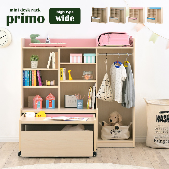 子供用机 キッズデスク ハンガーラック 木製 キッズテーブル ミニテーブル 収納付き 可動棚 引き出し付き ミニデスク 3点セット primo(プリモ) Hiタイプ ワイド