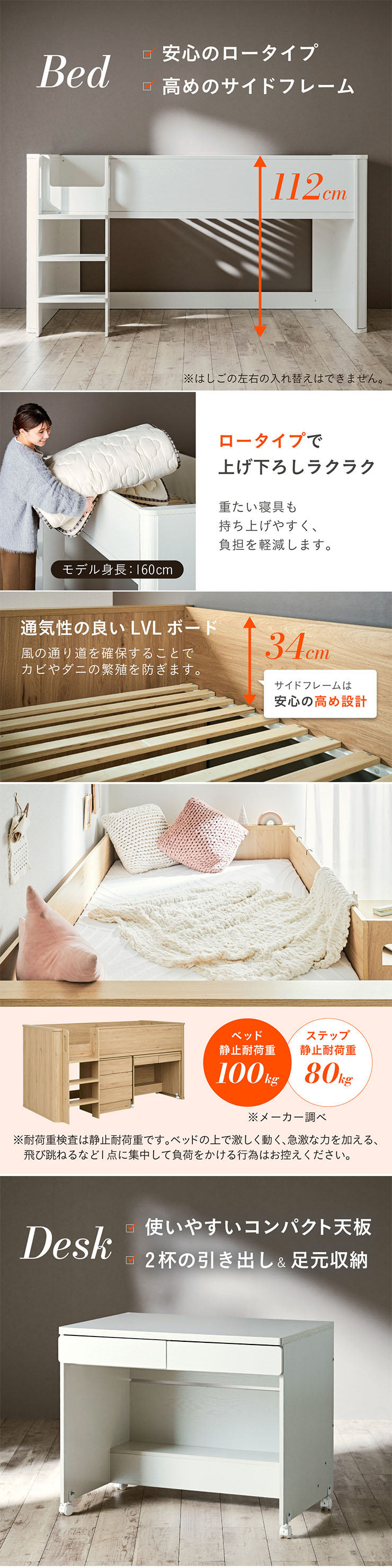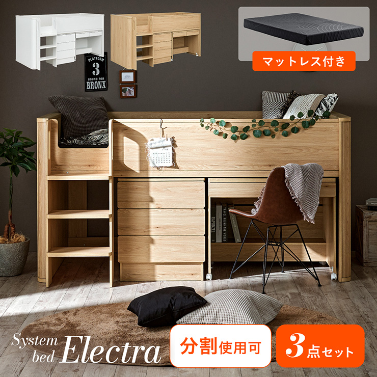 システムベッド 子供 大人用 ロータイプ デスク ロフトベッド 机付き マットレス シングル Electra エレクトラ 2色対応 + Unity ユニティ ブラック