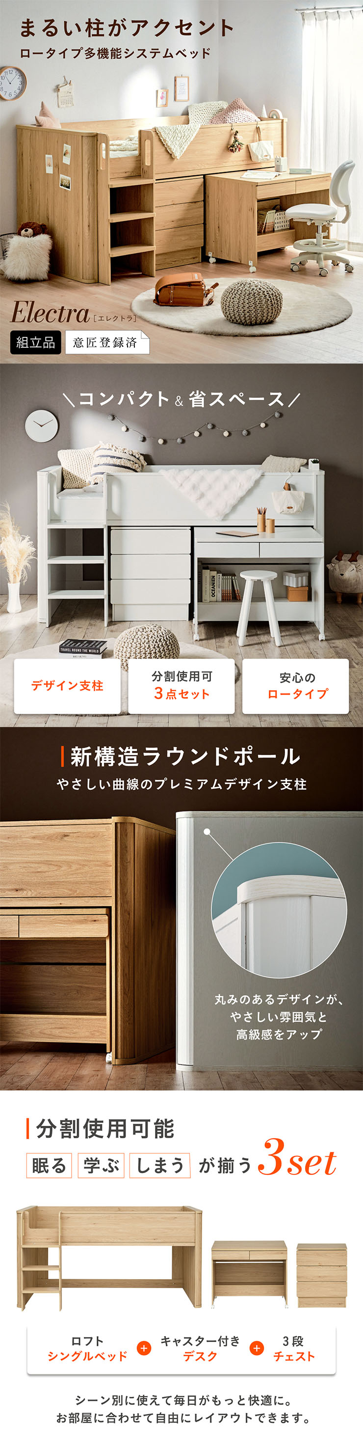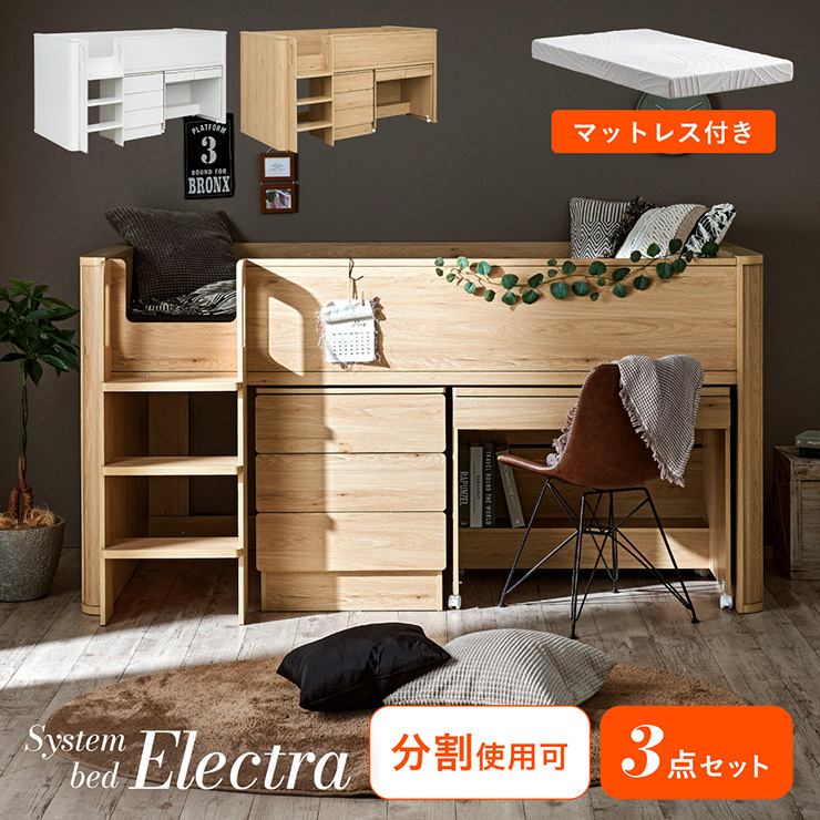 システムベッド 子供 大人用 ロータイプ デスク ロフトベッド 机付き マットレス シングル Electra エレクトラ 2色対応 + Unity ユニティ ホワイト