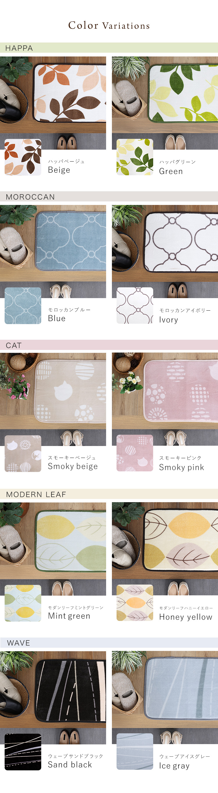 ハッパベージュ・ハッパグリーン・ハニーイエロー・アイスグレー・モロッカンミストブルー・ミントグリーン・モロッカンアイボリー・ペールサンドブラック・スモーキーベージュ・スモーキーピンク