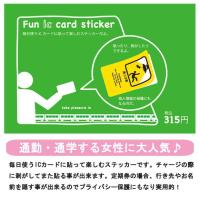 毎日使うICカードに貼って楽しむステッカー。他の人に見られたくないカードに大活躍!安心してお財布を取り出せます。ICカードの定期券など、行き先や通勤区間のわかるものに貼ればプライベート情報を隠せるので、他人の目を気にせずに安心してお使い頂けます。デザインもユニークな物が多く、持っていて楽しくなるステッカーです。チャージの際に剥がしてまた貼ることが出来ます。本体サイズW82×H50mm。現金チャージや定期券の更新の時など、カードを機械に入れる場合はカードがつまり故障の原因となるので、必ずステッカーを剥がしてからお使いください。